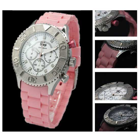 This ladies’ quartz analog watch boasts a white dial complemented with a silvery bezel. The round dial is ingeniously crafted with glittering stones as hour markers and the three delicate sub-dials lend extra functionality the fashionable timepiece. This wristwatch also comes with one crown and two push buttons, one of which is pink-coated with a matte finish for a chic touch. The baby pink link bracelet completes this ravishing watch, stealing the spotlight effortlessly.