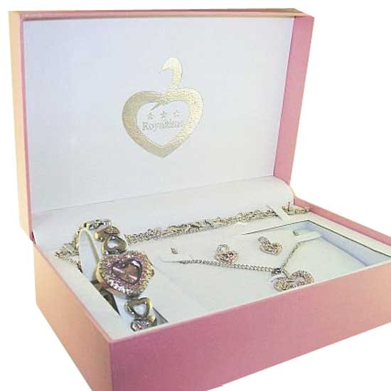 The gift set includes a ladies' quartz analog watch, a bracelet, a pair of earrings and a necklace. The watch runs on a Japanese movement and it features a nickel-free plating. This set makes an excellent gift for all ladies.