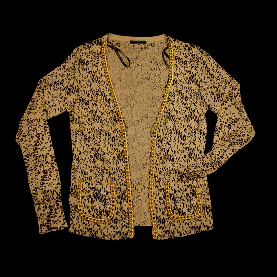 This ladies’ cardigan flaunts allover animal patterns for a captivating look. The golden hued chain decoration along the plackets and the pockets add spice to the design facilely. This fabulous cardigan is sure to make you outstanding from the crowds.