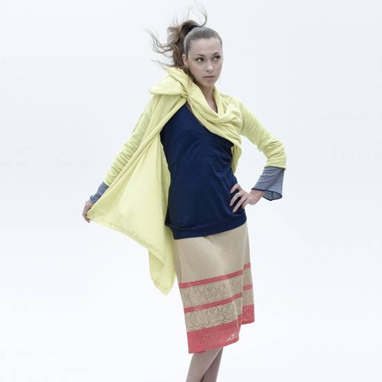 This is a set of ladies' ready-to-wear garment including a cardigan, a blouse and a skirt. The range is suitable to be worn in spring and autumn. Each of these items can be easily matched with other desired clothings to create unique style.