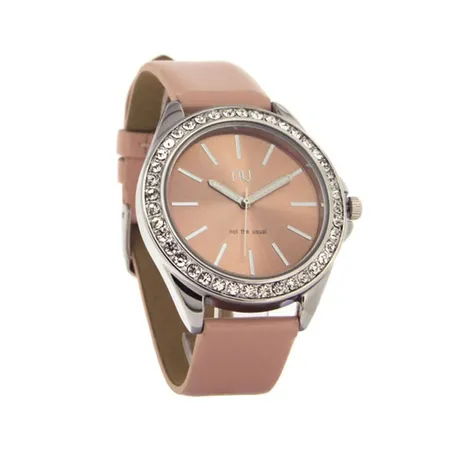 This watch features a rhinestone-embellished case embedded with a light pink, branded round dial with three hands and indices, neat, elegant and feminine. The watch case is supported by an N:U's patented leather-look strap. This sparkling watch is operated by a Japanese quartz movement for punctuality and is a great timepiece to accentuate your grand outfits for formal events.