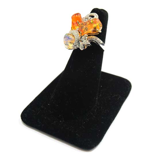 Featured is a dazzling diamond ring with an exquisite design. The ring is designed in a fancy shape and decorated with crystal-clear colored stones. This contemporary design matches with ladies' apparel perfectly.