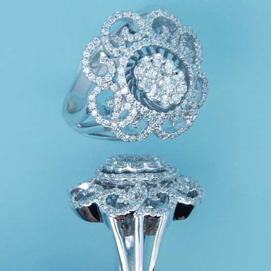 Showcased is a gorgeous ring with a flower-shaped base. Dazzling diamonds highlight the center of the ring. The embracing setting comes in a protruding style, emblazoned with the embellishment of dazzling diamonds.