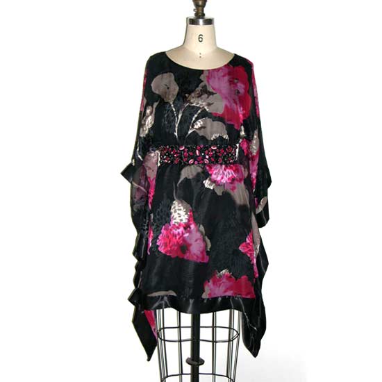The ladies' dress features a round neck and a pair of flared sleeves. The dress comes in a black color decorated with pink floral patterns, adding an extra touch of style. This dress surely will enhance your grand wardrobe with its pleasing design.