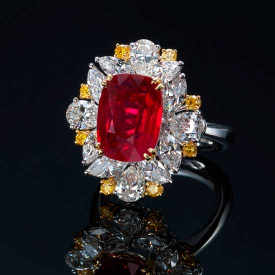 Featured here is an exceptionally beautiful ruby ring weighing 5.08ct. The pear and marquise-shaped diamonds surrounding offer added elegance and dazzling glamor. This scintillating diamond ring makes a timeless expression of luxury.