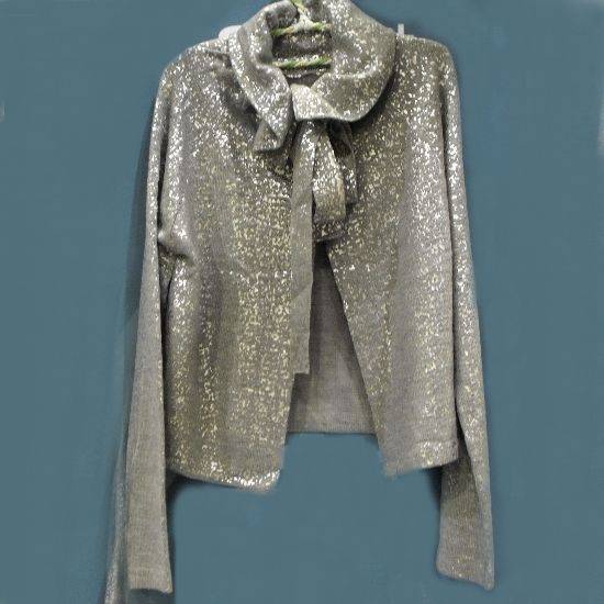 This long-sleeve ladies' cardigan features a ruffle neck with a tied ribbon closure for a babydoll look. The entire piece is covered in a sparkling silver print for a glittery effect. You can wear it to parties and stand out from the crowd.