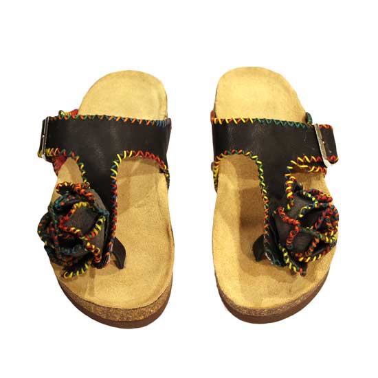 Displayed is a pair of ladies' sandals featuring an open thang design with black straps. Handmade in Hong Kong with soft sheep leather, these sandals are soft and comfortable. This high quality pair of ladies' sandals is great for summer days.