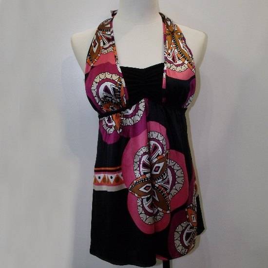 This ladies top comes with a body-flattering halterneck and an empire waist design. The smooth surface features exotic prints for a sassy, tropical look. It is the ideal summer clothing suitable for all parties and beach occasions.