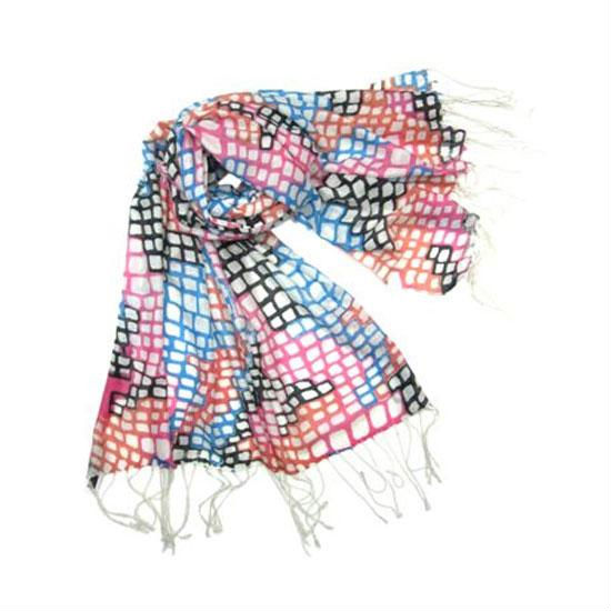 Displayed is a scarf with colorful, irregular patterns for a stylish look. The scarf can be worn in many ways to fit your daily moods. The polyester composition is comfy and keeps your neck warm from the cold breeze.