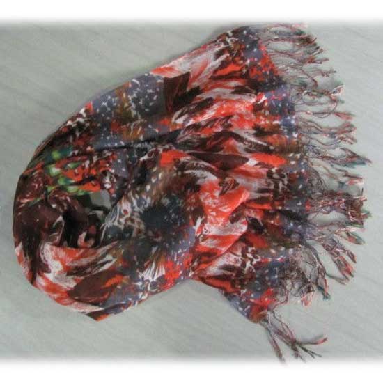 This ladies' scarf features an attractive and elegant design and comes with 100% acrylic construction. It is fully printed with eye-catching multi-colored patterns to create a trendy look. The delicate fringed edges complete this lightweight and soft scarf.