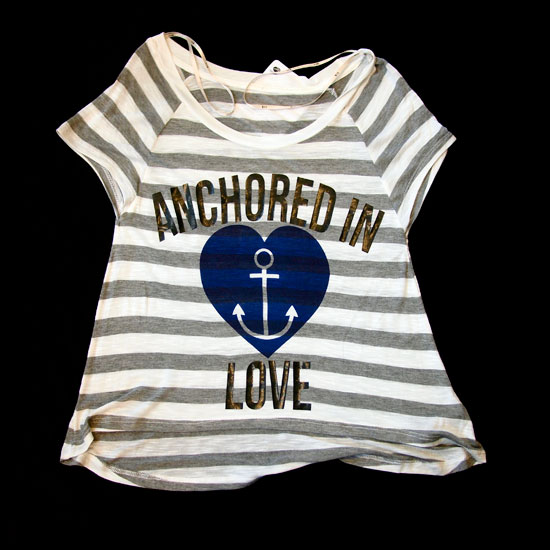 This ladies’ striped T-shirt comes with a scoop neck and cap sleeves. The light gray and white stripes make perfect harmony with the navy heart print and nice lettering. Made of 100% viscose, this stylish tee promises gratifying wearing comfort.