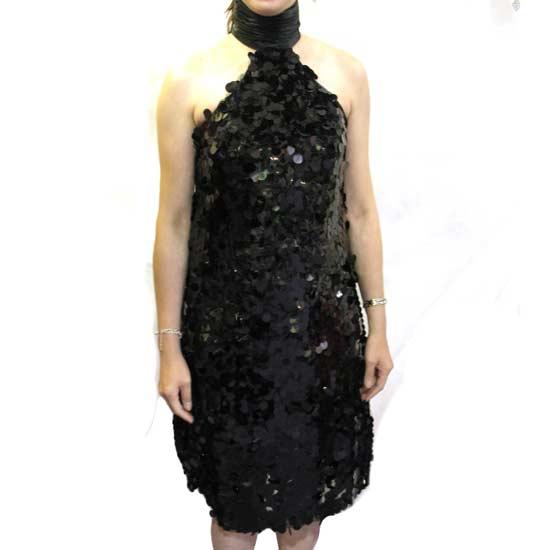 The ladies' sequined dress boasts a halter neck with a thick neck band for a Gothic touch. The allover sequin embellishments showcase a glamorous look. Stand out from the crowd with this gleaming black sequin dress.