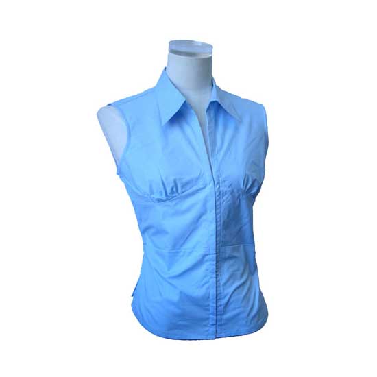 This shirt comes in a sharp-blue color to exude a fresh and young style. It features a sleeveless cut with a slim waist to showcase your slender figure. This plain yet modern design makes this shirt a necessary item for an office look.