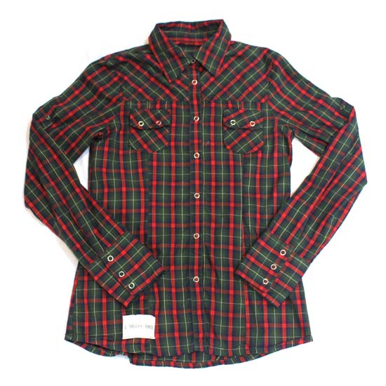 This long-sleeve shirt comes with a slim cut for ladies. The shirt features red-and-green checked patterns, decorated with two flap pockets. This shirt makes a stylish item for easy mix and match.