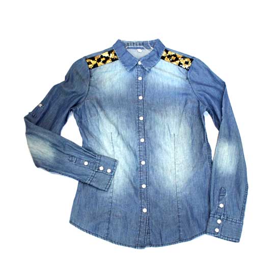 This blue-gray shirt features sequined patches on the shoulders. The finely manufactured cotton shirt delivers satisfying wearing comfort. It is a great addition to your stylish wardrobe.