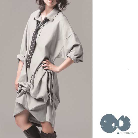 This ladies’ neutral shirt dress feature a drawstring design with 20 buttonholes to play multiple styles. A tie with polka dots is included to add an appealing touch. This ladies’ one-piece dress goes great with a pair of boots.