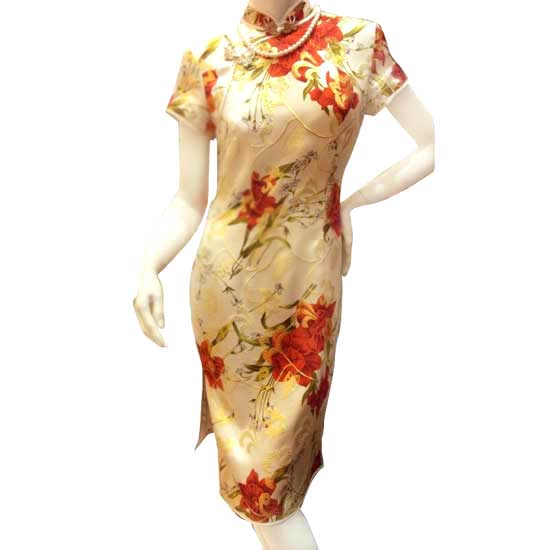This stylish cheongsam features short sleeves and a classical standing collar. The delicate embroidery with gold lines is added to show exceptional glamor. Made of silk material, this cheongsam is designed with the beautiful red flower patterns for a touch of elegance.
