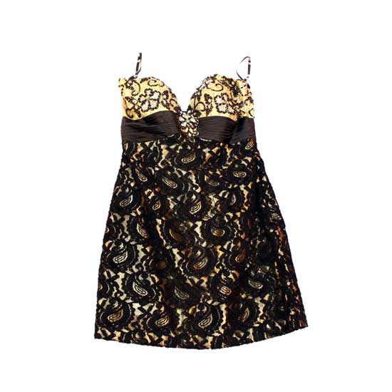 This is a short evening dress with a low-cut heart-shaped neckline and a pair of spaghetti straps. It features a golden background with sophisticated black patterns. The dress is also adorned with sparkling beads for added charm and glamor.