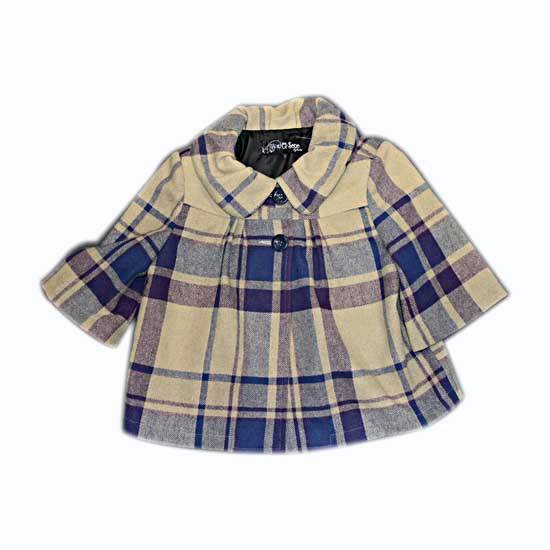 This ladies' jacket features a lovely short and loose cut with middle sleeves. The blue-and-purple checked patterns give this jacket a sense of elegance. This wool jacket is a perfect choice for your winter collection.