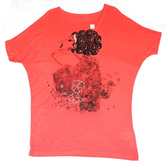 The ladies' short-sleeve T-shirt showcases a woman print with shiny stone decoration. It is delicately knitted with top-grade cotton for comfy wear. Pair this T-shirt with jeans to create a casual look.