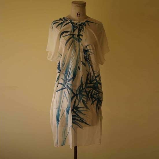 The ladies' silk cotton dress boasts hand-painted bamboo branches to showcase artistic elegance. The batwing sleeves and loose-fit styling offer incredible comfort. This flattering silk cotton dress is great for work and play.