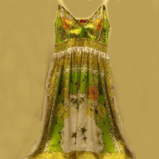 This gorgeous sleeveless dress comes in short length which falls above the knees. It features all-over floral patterns in green, white and yellow colors. The spaghetti straps and empire waistline flatter any body shape. Spotlight your fashionable taste with this attractive deep V-neck dress.