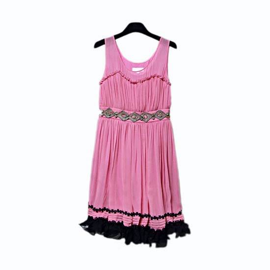 The ladies' dress flaunts a lovely design in pink. It comes in gathered patterns from the bust down to the ruffled hems. This dress is decorated with silvery trim around the waist for added style.