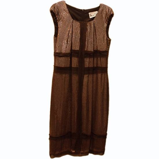 The ladies' dress features a round collar and a pair of cap sleeves. The dress bodice is fully set with sequins to create a touch of timeless elegance. This pretty dress makes a pretty way to enhance the grand closet of ladies.