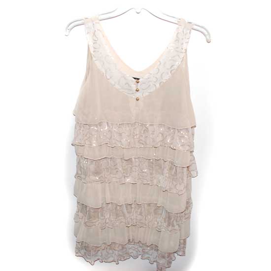 The ladies' dress has a V-neckline and front golden bead accents. The soft ruffled layers add a touch of feminism. This ladies' dress can be worn alone or with spray-on pants.