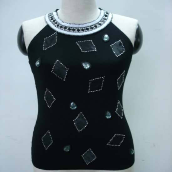Featured is a ladies' sleeveless top with a halter neck. This fitted-cut style has crystal embroidery and patchwork all over, which add a unique touch to the entire piece. This is a perfect addition to your casual wardrobe.