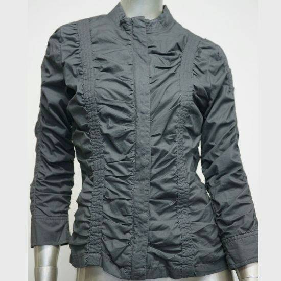 The stylish three-quarter-sleeve jacket comes with a stand collar and a concealed closure. It features heavily-gathered details throughout. It is finished with a plain hue that boasts simple elegance. Finely tailored with an exquisite fabric, it promises gratifying comfort and warmth.