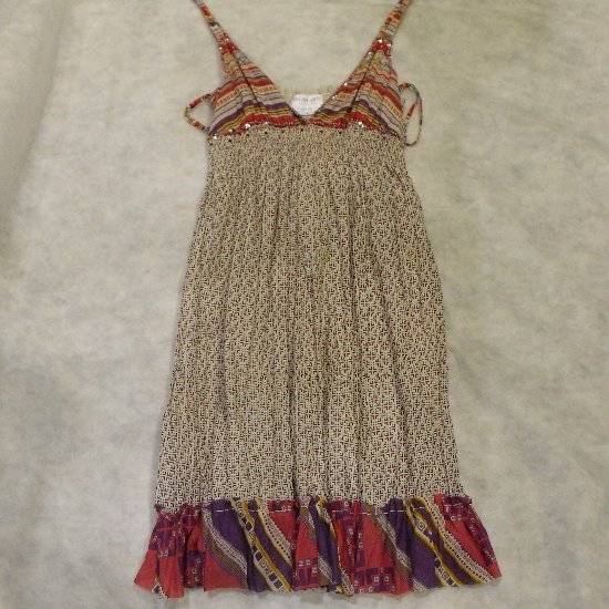 This casual dress features a flattering smocked waist and ruffled trim. The V-shape neckline and the bust are decorated with beads for a fashionable look. This ethnic flavored piece is a chic and stylish wardrobe essential for the summer.