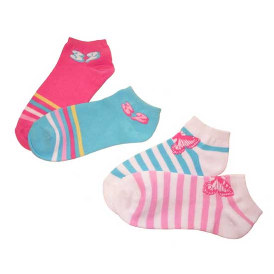 Displayed here are four ladies' socks made with cotton. They feature colorful stripes and numeral or butterfly-shaped patterns. These socks are also very pliable and cozy to wear.