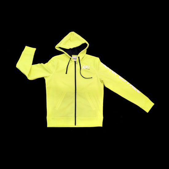 This ladies' sports jacket is smart-looking and stylish with its bright fluorescent yellow color. It conveniently comes with a hood with a matching black drawstring and 2 side pockets. The silver characters on the left arm make the jacket more unique.