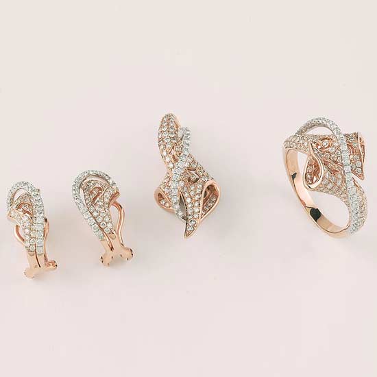 This exquisite jewelry set consists of a pair of earrings, a pendant, and a ring. The earrings and the pendant are shaped irregularly with many small shimmering stones mounted on them. This specially designed fine jewelry set is ideal for sending to your beloved one.