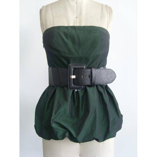 The fashionable strapless top features a bubble hem with pleated patterns. The oversized buckle belt on the waistline adds a dramatic style to the entire appearance. The new and special "memory fabric" can keep the shape of the top as you wish.