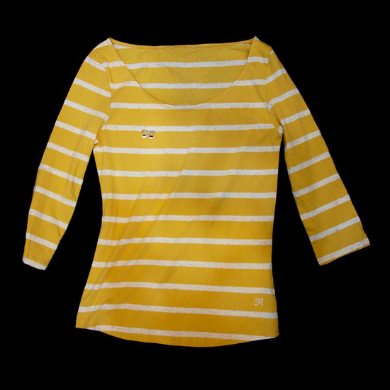 This ladies’ T-shirt features horizontal stripes of yellow and white with a bow decoration at the chest. It is fabricated from pure cotton for comfortable wearing. This classic stripe T-shirt is an ideal choice for ladies.