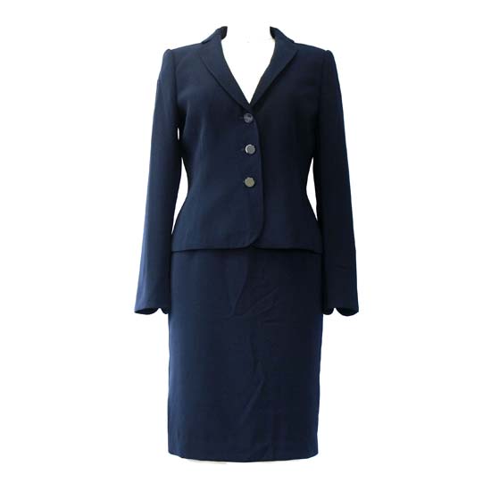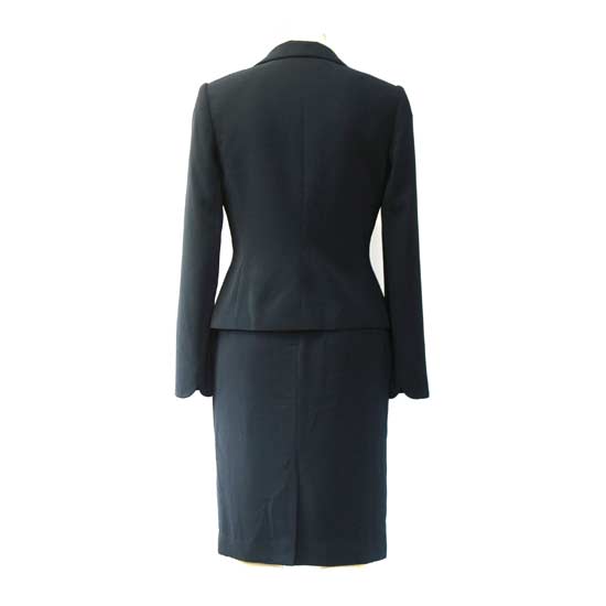 Showcased is a set of ladies’ suit coming with a blazer and a skirt. The blazer is designed in a 3-button style, while the skirt features a slim knee-length cut. This suit makes an elegant choice for formal occasions.