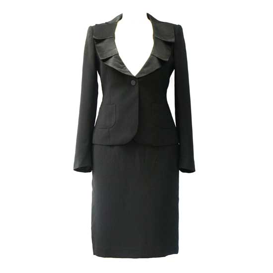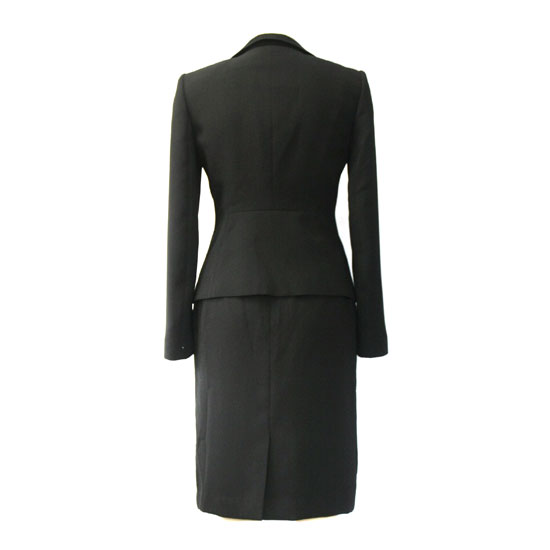The beauty of this ladies’ suit lies in the stylish blazer. The one-button blazer comes with a wide-cut neck, featuring unique cuts on the collar. The matching skirt comes with a straight knee-length cut to make this suit a subtle design for formal occasions.