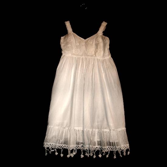 This beautiful summer dress features delicate hand embroidered floral patterns on the bodice. Also featured is a crocheted hem that is both cute and feminine. The dress comes with a gathered empire waistline that emphasizes your body curves. A flowing full skirt gives this dress a flattering silhouette. The soft and lightweight material makes it a perfect choice for breezy summer days.