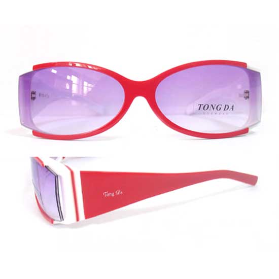 This pair of sunglasses comes with a broad, bright red frame. It features huge violet lenses for protection and style. The two tone design adds a twist to the sunglasses.