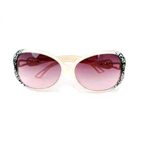 Showcased is a pair of ladies' sunglasses designed with tinted red lenses. Decorative black patterns are added to the sides of the white frame. This pair of stylish sunglasses is a charming accessory for the day and the night.