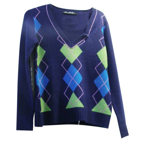 This sweater has a deep v-neck and long sleeves. Moreover, it is designed in intersia patterns. This blue sweater is perfect to match up with different kinds of shirts, jeans and skirts.