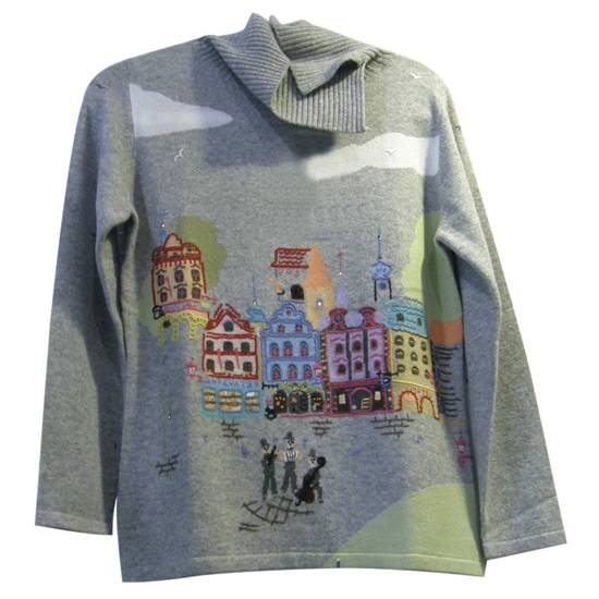 This light grey sweater has a turtleneck and long sleeves. This intersia knitting sweater is designed with embroideries and decorative stones. Moreover, it is suitable to be worn with jeans and skirts.