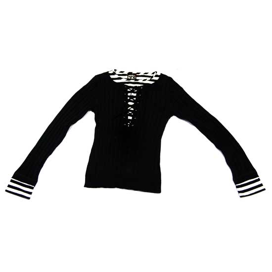 This ladies' sweater boasts a subtle yet stylish design. It is black in color, with the neck and cuffs banded with black and white striped fabric. The front of the sweater is decorated with pinholes and self-tie strings for style.