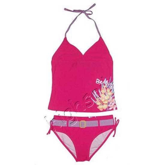 This ladies' swimsuit comes with a two-piece design in bright pink. The top comes with a halter neck and a V-neckline. Printed belt pattern and knot detail decorate the swimsuit bottom.