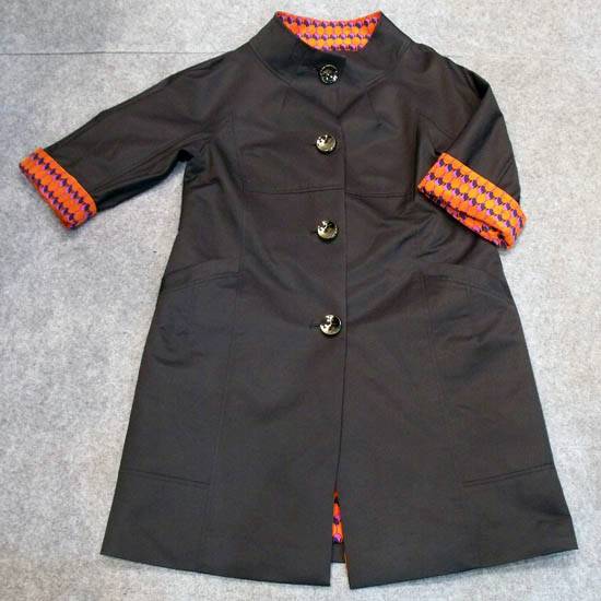 This stylish swing coat comes in a mid length, which falls above the knees. It has a stand collar and a four-button front. The lining features bright geometric patterns, which can be seen on the rolled-up cuffs. The loose-fitting bodice flatters any body shape.