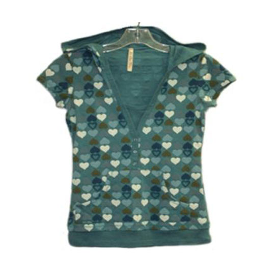 Presented here is a short-sleeved T-shirt that is designed for ladies. It features a hood and heart patterns for a delicate touch. This ladies' T-shirt is well made of high-quality material for gratifying wearing comfort.