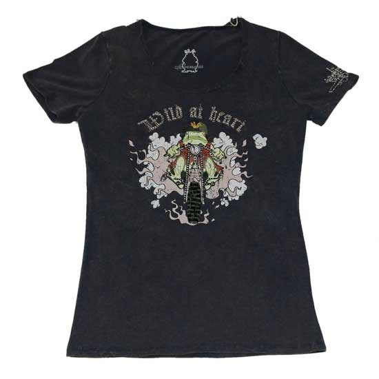 Featured here is a short-sleeve ladies' T-shirt. A print pattern of a frog riding a motorcycle makes this T-shirt interesting. Comfortable with a flattering fit, this ladies' T-shirt appeals to a range of consumers.