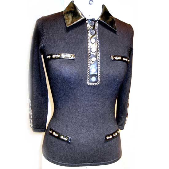 This ladies' T-shirt features a club collar, a 7-button placket and convertible 3/4 length sleeves. The shiny faux leather collar and placket give this wear a chic look. With rayon and nylon blended construction, the T-shirt is warm, soft and lightweight.